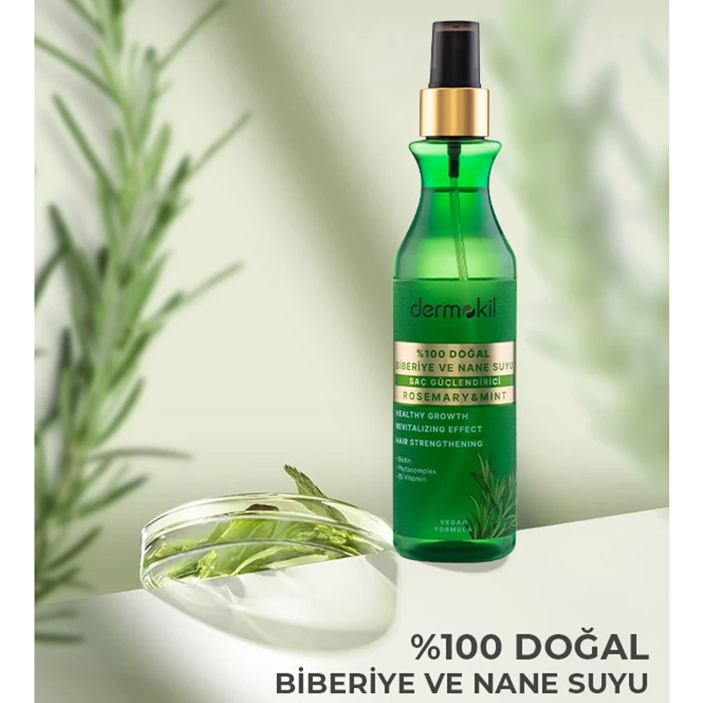 Dermokil % 100 Biberiye ve Nane Suyu; Amino Asit Kompleks, Keratin, Vitamin B5, Kafein, Biotin ve birbirinde farklı bitkisel içerikle zenginleştirilerek geliştirilmiştir. Buhar distilasyonu ile saflaştırılmış organik biberiye suyu ve doğal nane suyu ile saçlarınızı dipten uca bakım yapar. Saçlarınızı besleyerek sağlıklı uzamasına katkı sağlar